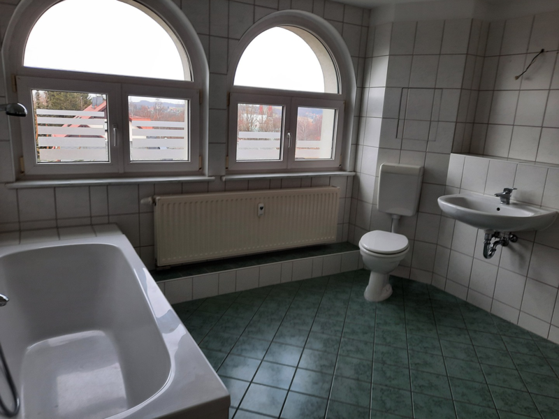 Das Bad ist mit Wanne, Waschbecken, Toilette und Waschmaschinenanschluss ausgestattet.
