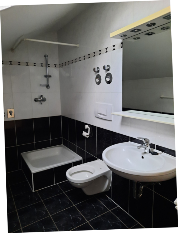 Das Bad verfügt über eine hochwertige Ausstattung bestehend aus Dusche, Waschbecken, Toilette und Waschmaschinenanschluss. Fußboden und Wände sind ganz gefliest.