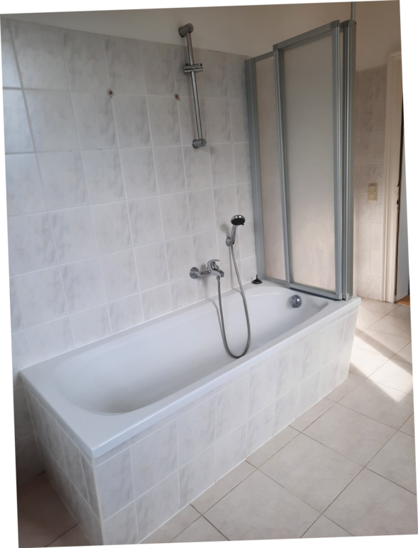 Das halbhoch geflieste Bad verfügt über eine Wanne, ein Waschbecken, eine Toilette und einen Waschmaschinenanschluss. Eine separate Toilette befindet sich zusätzlich im Treppenhaus.